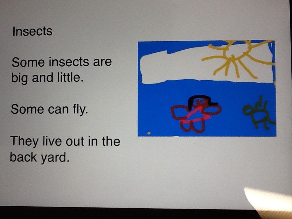 One of the most exciting aspects of using the iPad is integrating it with the content I am covering in class.  We’ve been discussing insects, and what 5 year old isn’t fascinated by bugs?  Today, my students used the Pages app as a science journal to write about insects and then created illustrations in their Whiteboard app.  Afterward, they imported their picture into the Pages document and re-sized it to fit on the page.  Throughout the process, they were buzzing (no pun intended) with each other about their insect facts, helping one another with importing their illustrations, and proudly sharing their masterpieces.  In addition, as children shared their work, they were reading and developing fluency.